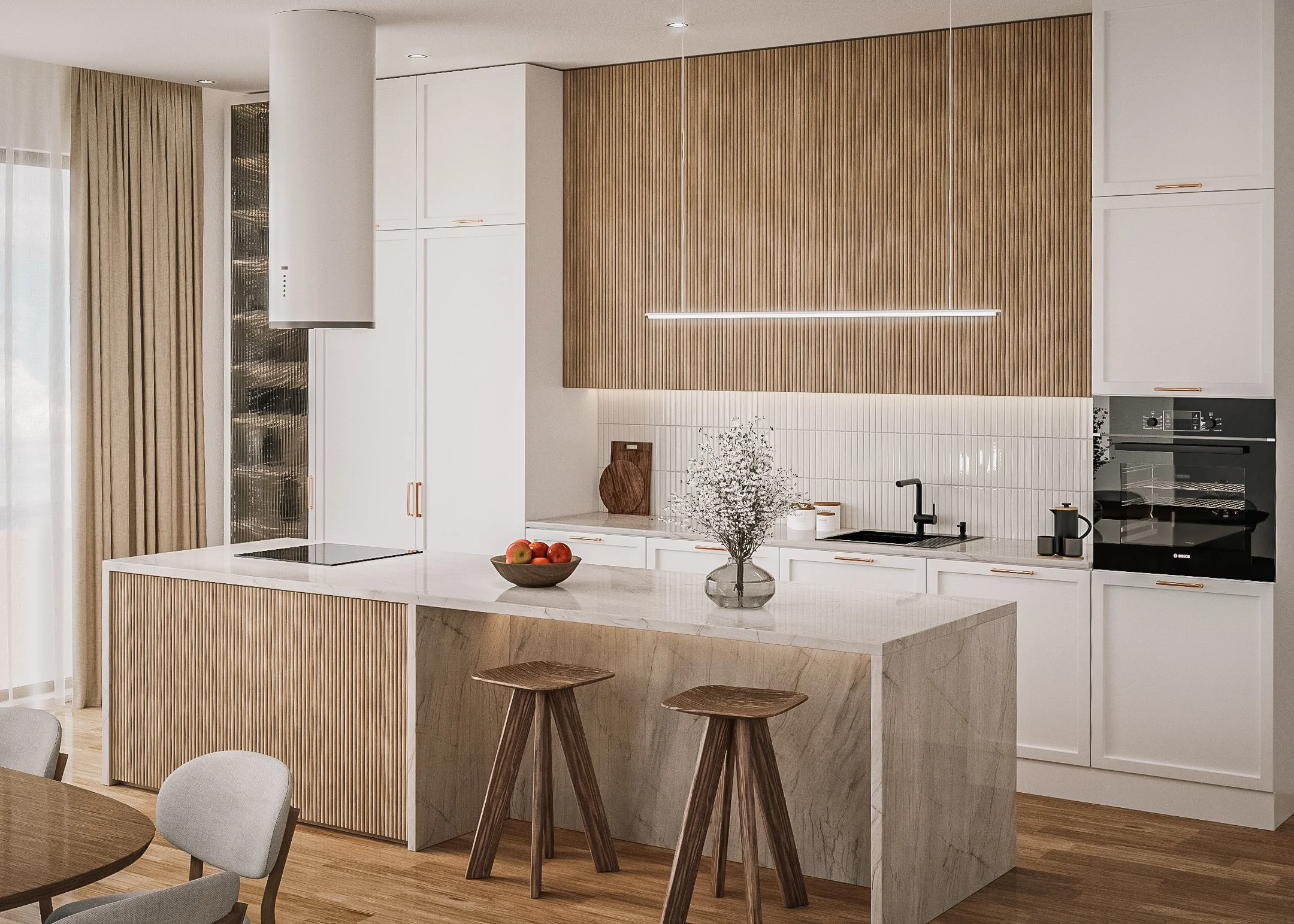 Nappali, étkező, konyha belső építészeti látványterv